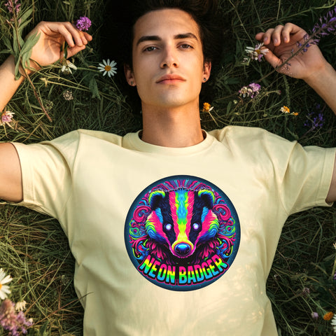 Step into the wild side with our "Neon Badger" T-shirt! This shirt features a striking neon badger head in a psychedelic style, making it a standout addition to any wardrobe. Perfect for animal lovers and fans of unique, eye-catching designs, this tee is sure to spark conversations wherever you go!