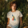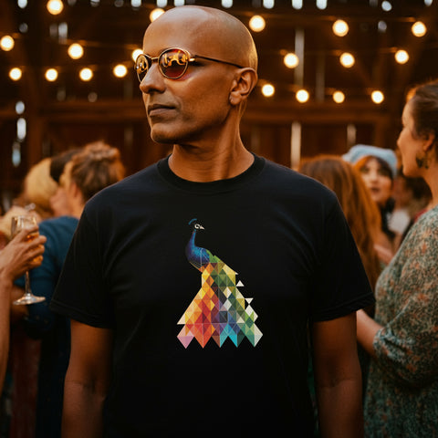 Show off your colors with our "Geometric Rainbow Peacock" t-shirt, featuring a striking peacock rendered in a modern geometric style and splashed with vivid rainbow hues. This artistic and stylish design is perfect for those who appreciate bold, contemporary art and want to express their vibrant personality. Comfortable and striking, it’s an ideal choice for making a statement while celebrating diversity and creativity.